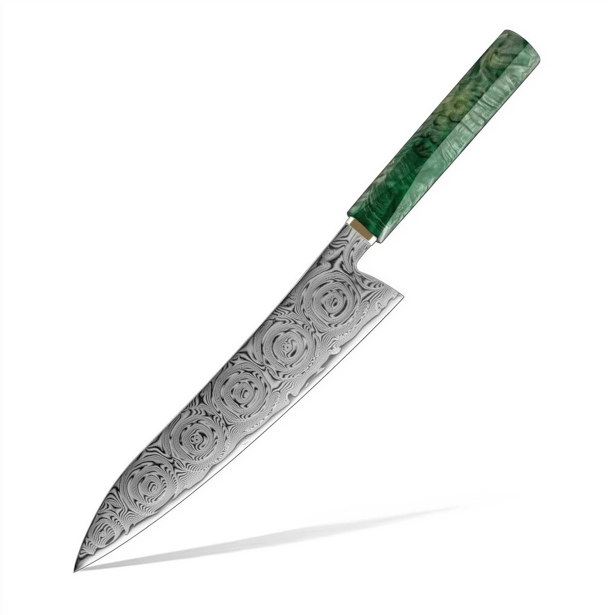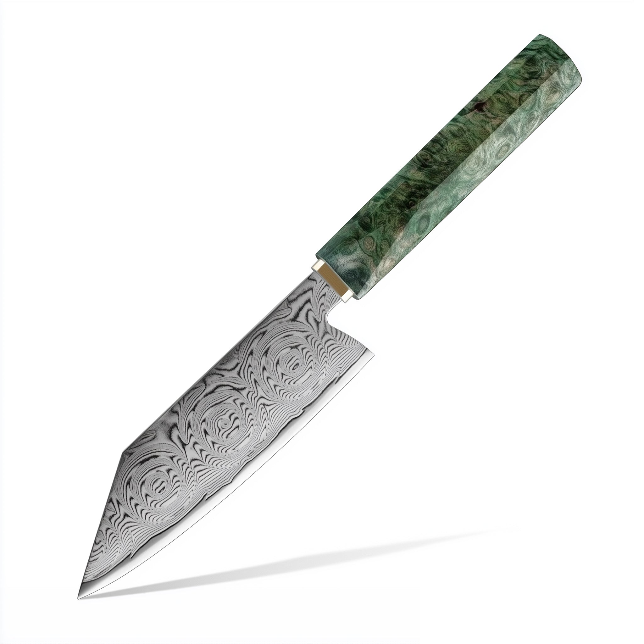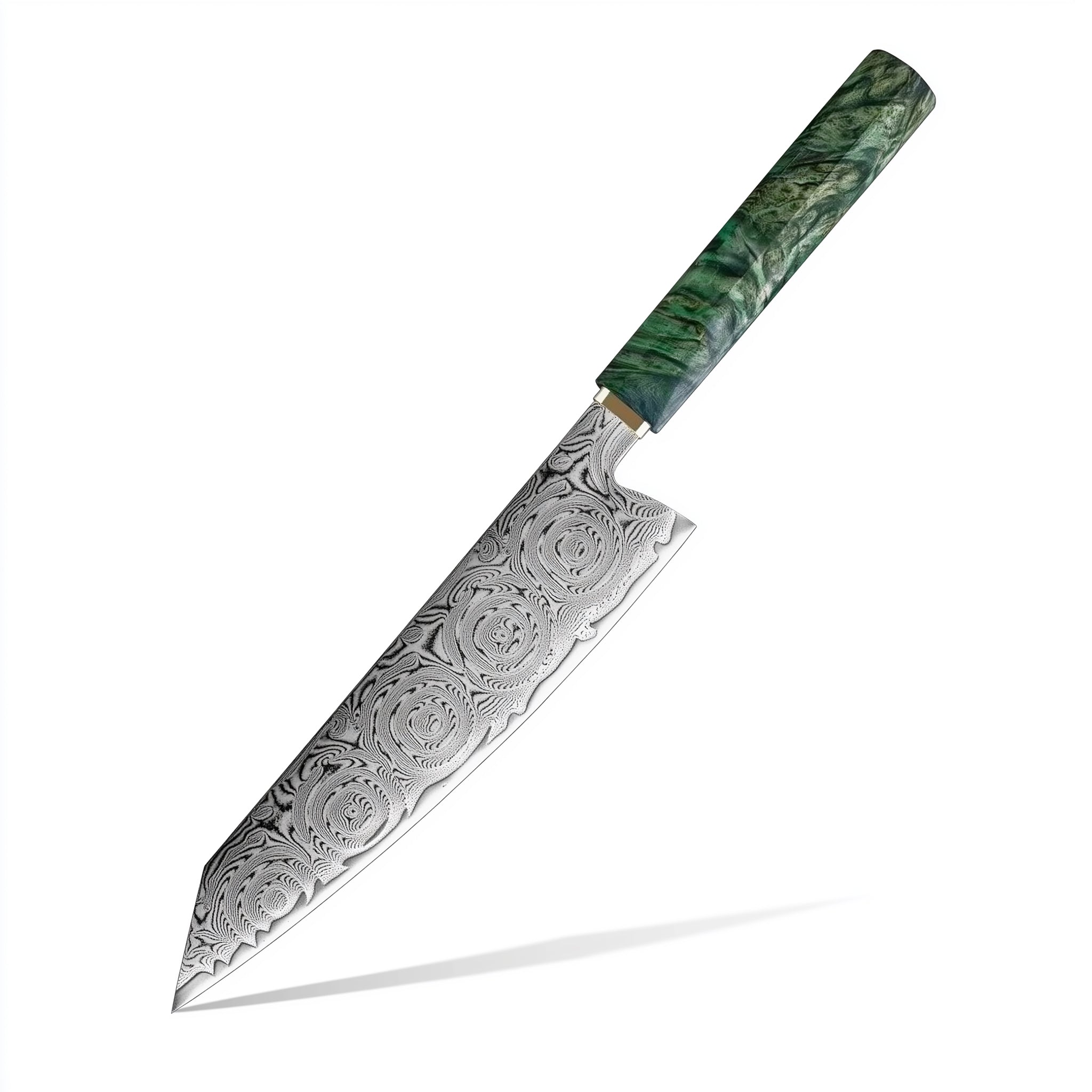 青崗系列,刀刃由67層大馬士革鋼製成,握柄處由綠色固化木+白銅製成,適用於日常廚房料理,切肉,切片,蔬菜瓜果類,(家禽骨頭以及冷凍食品等堅硬的食物會影響刀的鋒利度,特殊需要請選擇專用砍骨刀)。