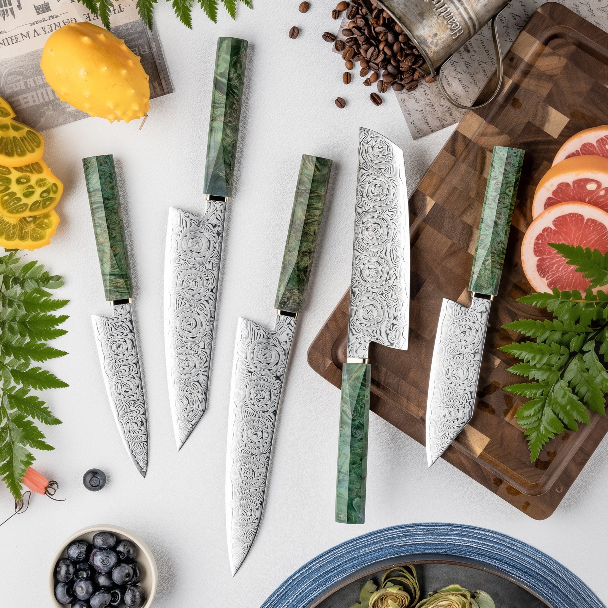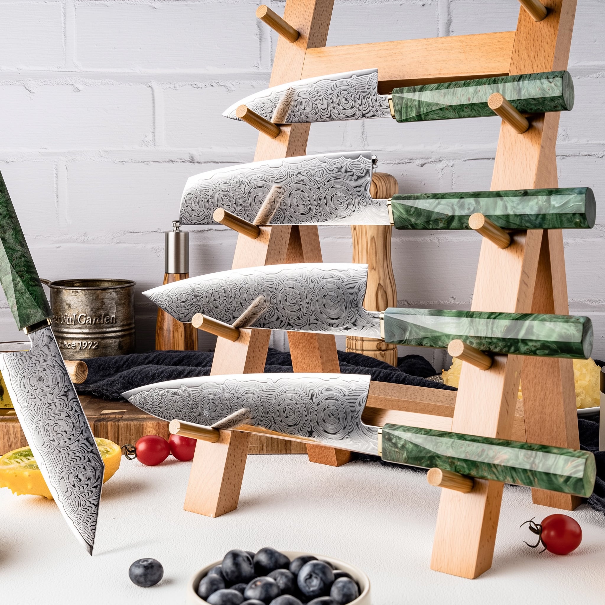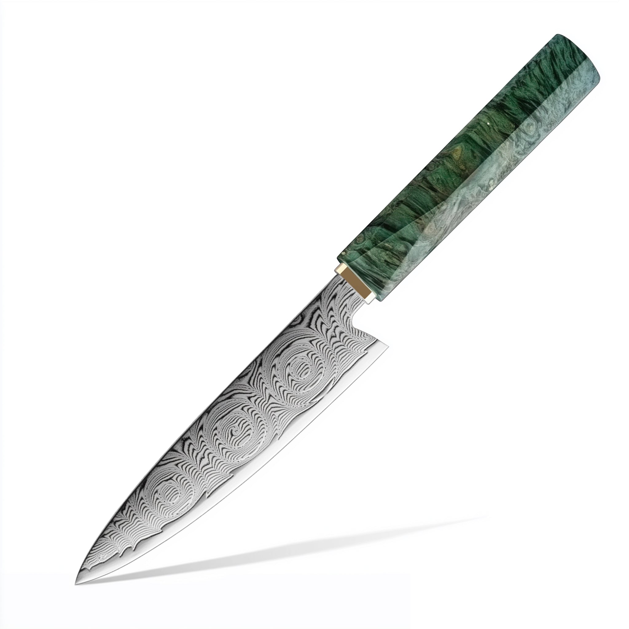 青崗系列,刀刃由67層大馬士革鋼製成,握柄處由綠色固化木+白銅製成,適用於日常廚房料理,切肉,切片,蔬菜瓜果類,(家禽骨頭以及冷凍食品等堅硬的食物會影響刀的鋒利度,特殊需要請選擇專用砍骨刀)。