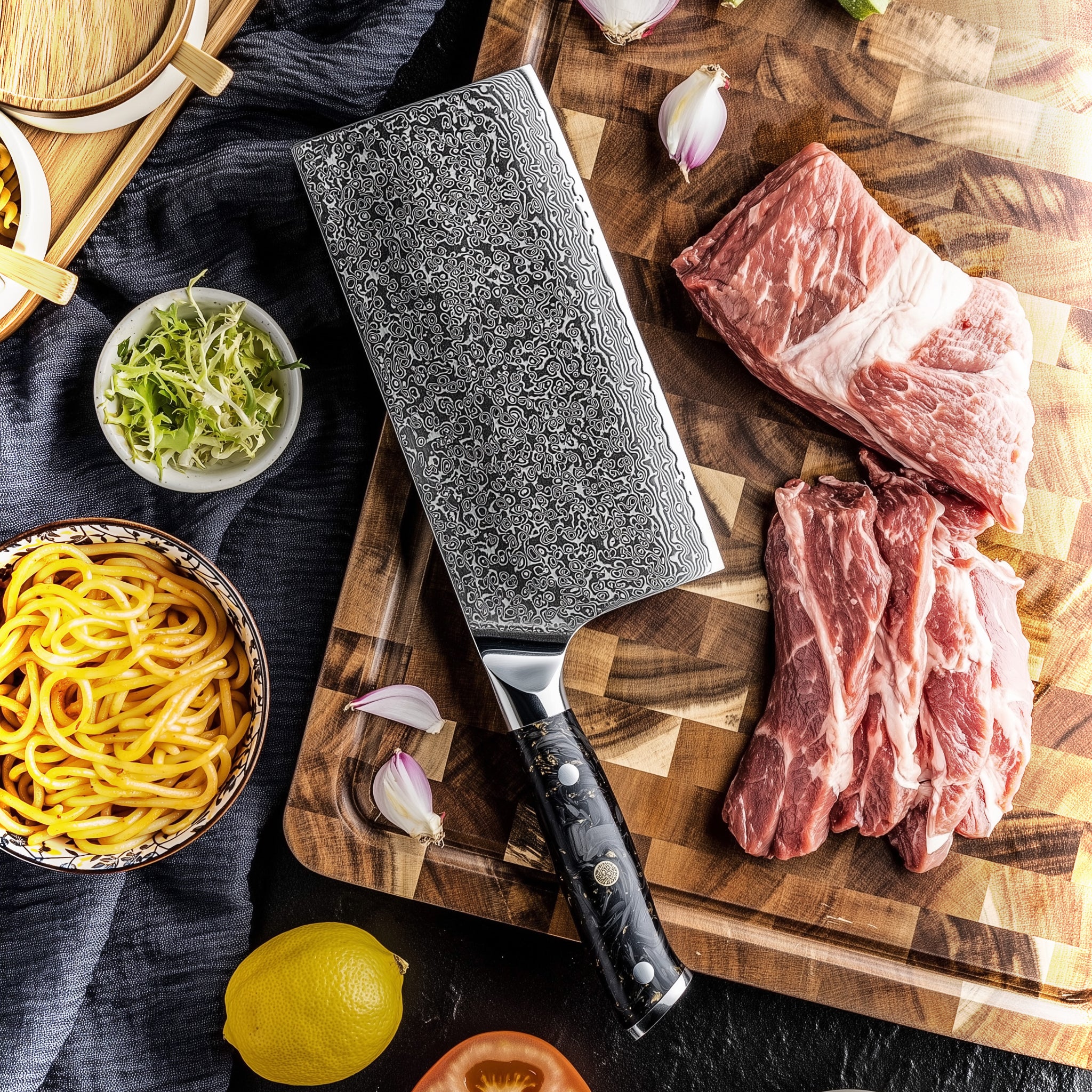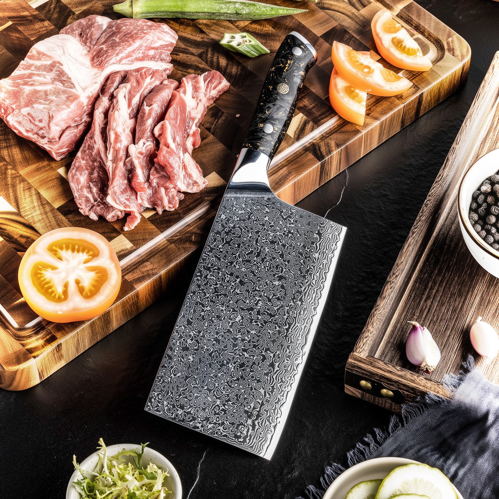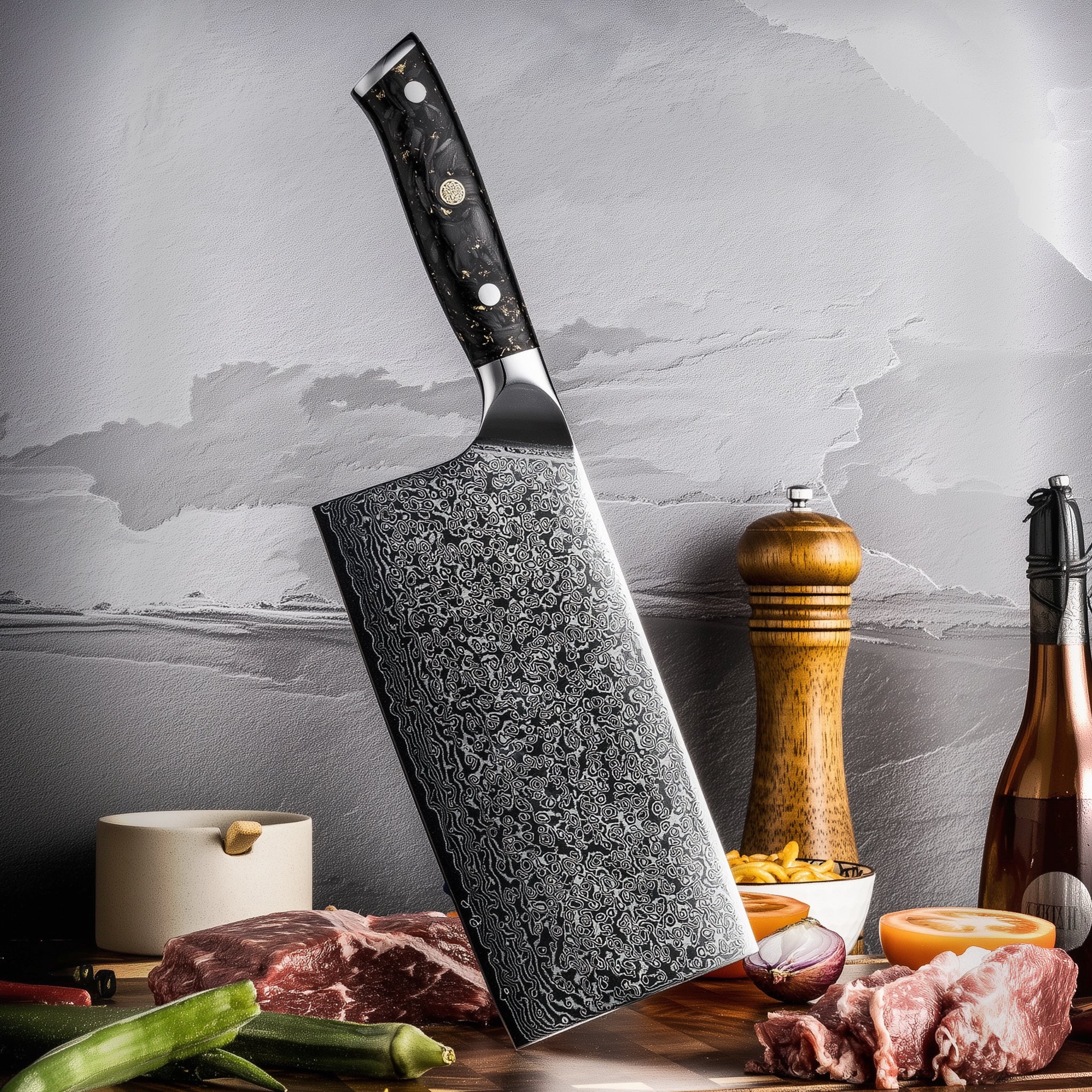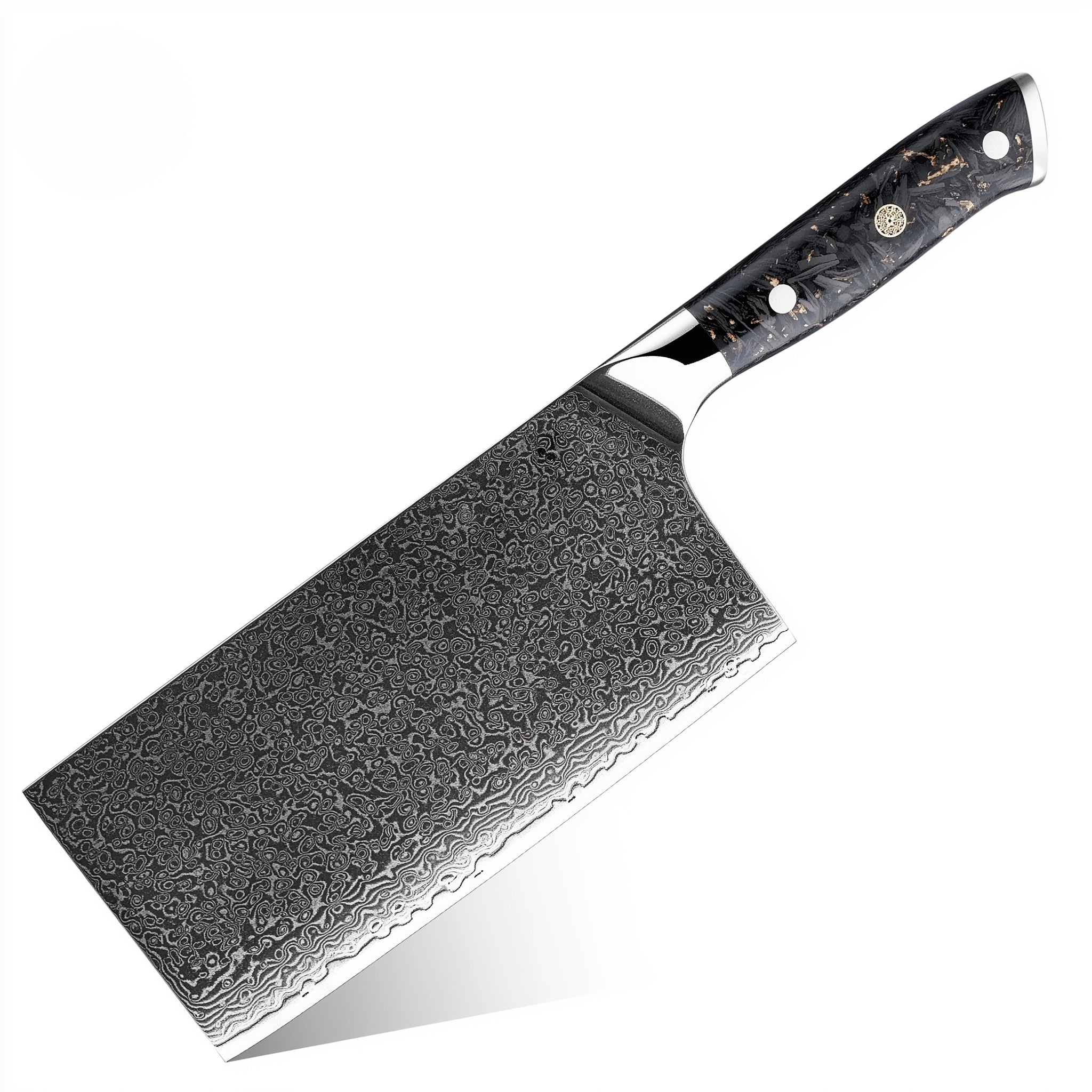 黑金系列,刀刃由67層大馬士革鋼製成,握柄處由碳纖維+金箔製成,適用於日常廚房料理,切肉,切片,蔬菜瓜果類,(家禽骨頭以及冷凍食品等堅硬的食物會影響刀的鋒利度,特殊需要請選擇專用砍骨刀)。
