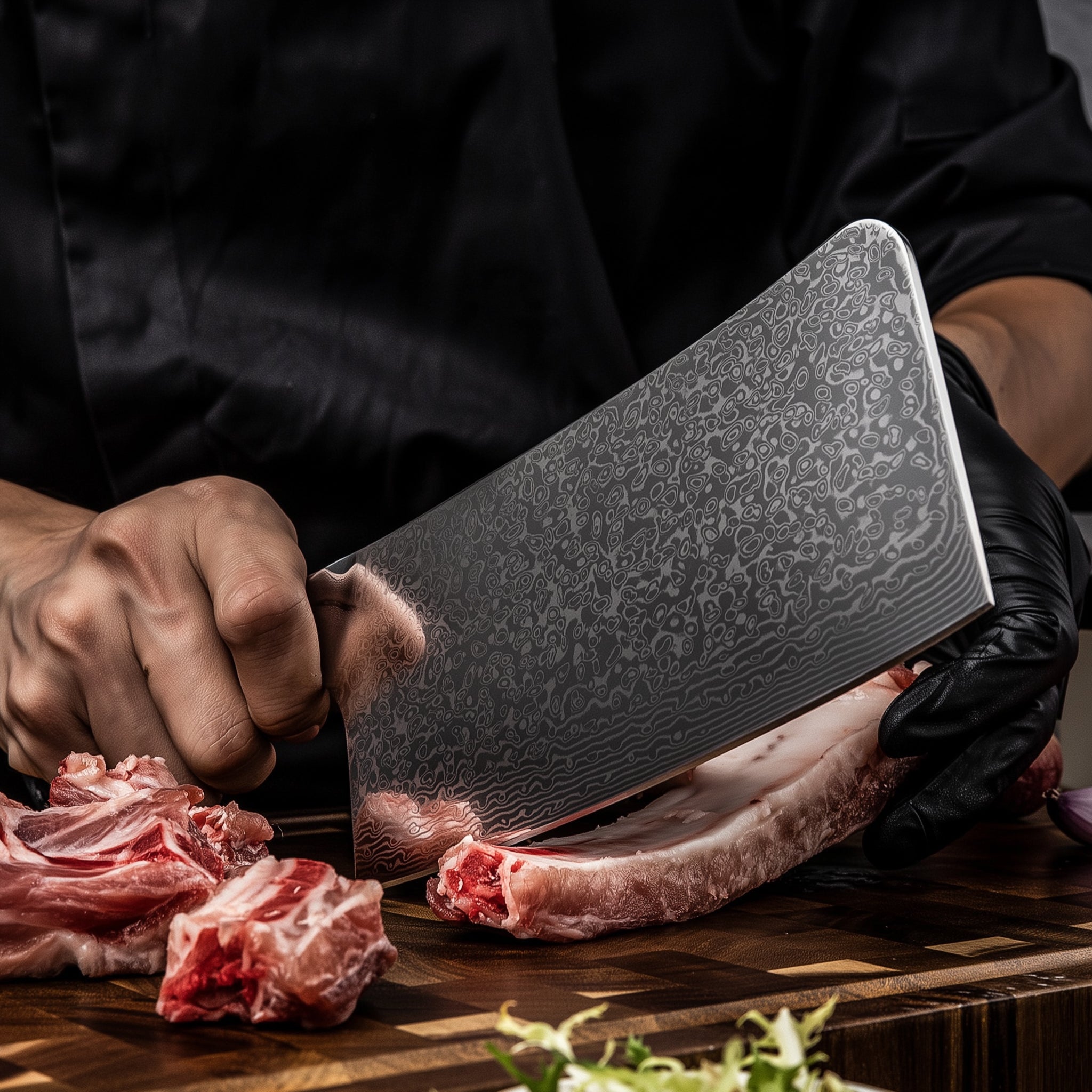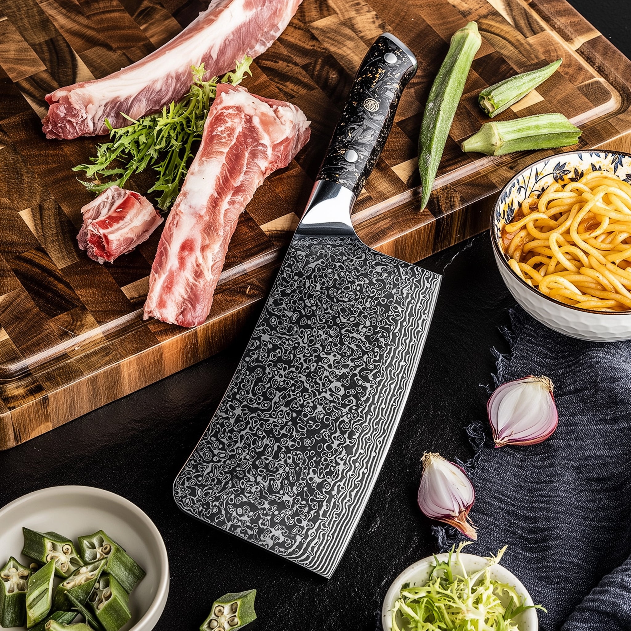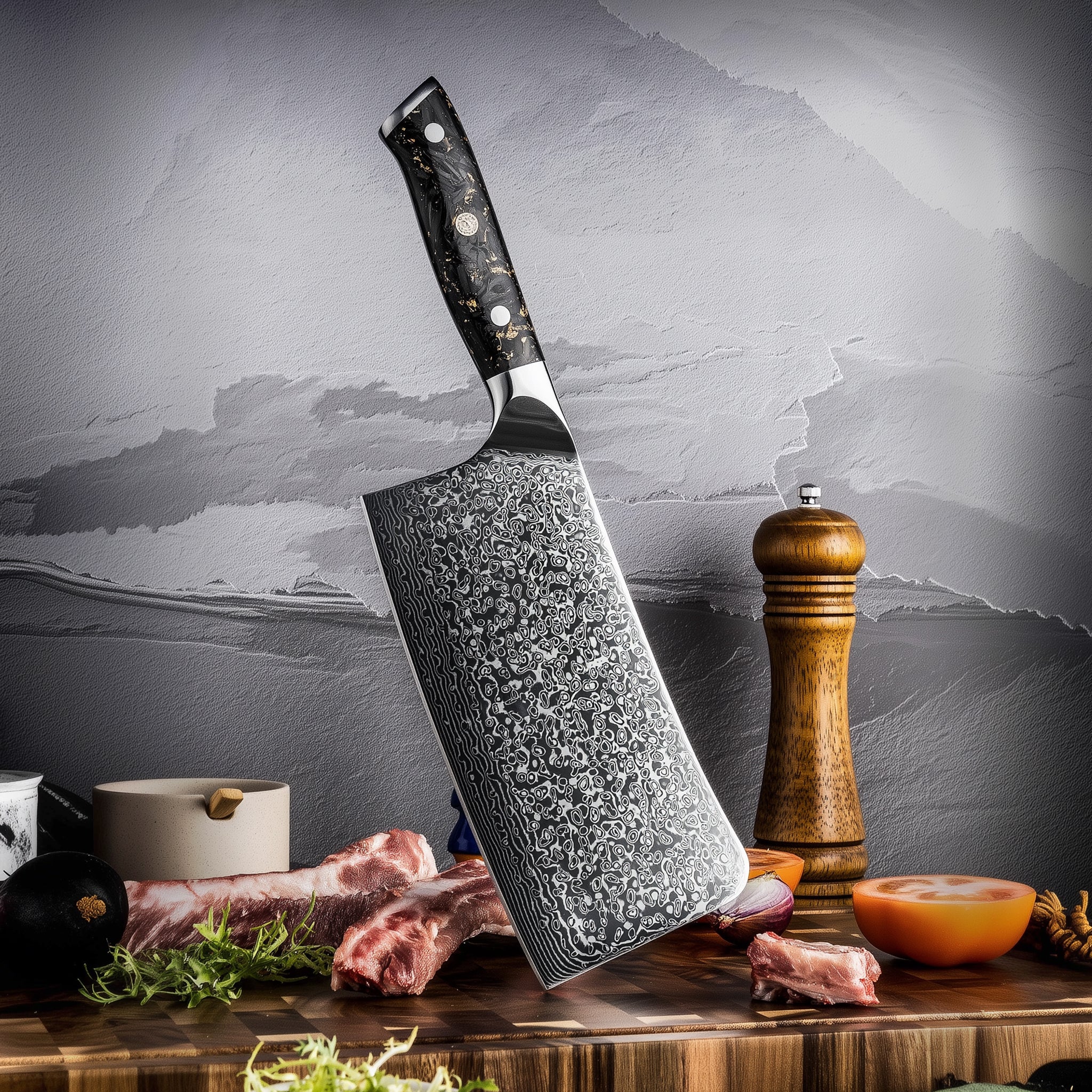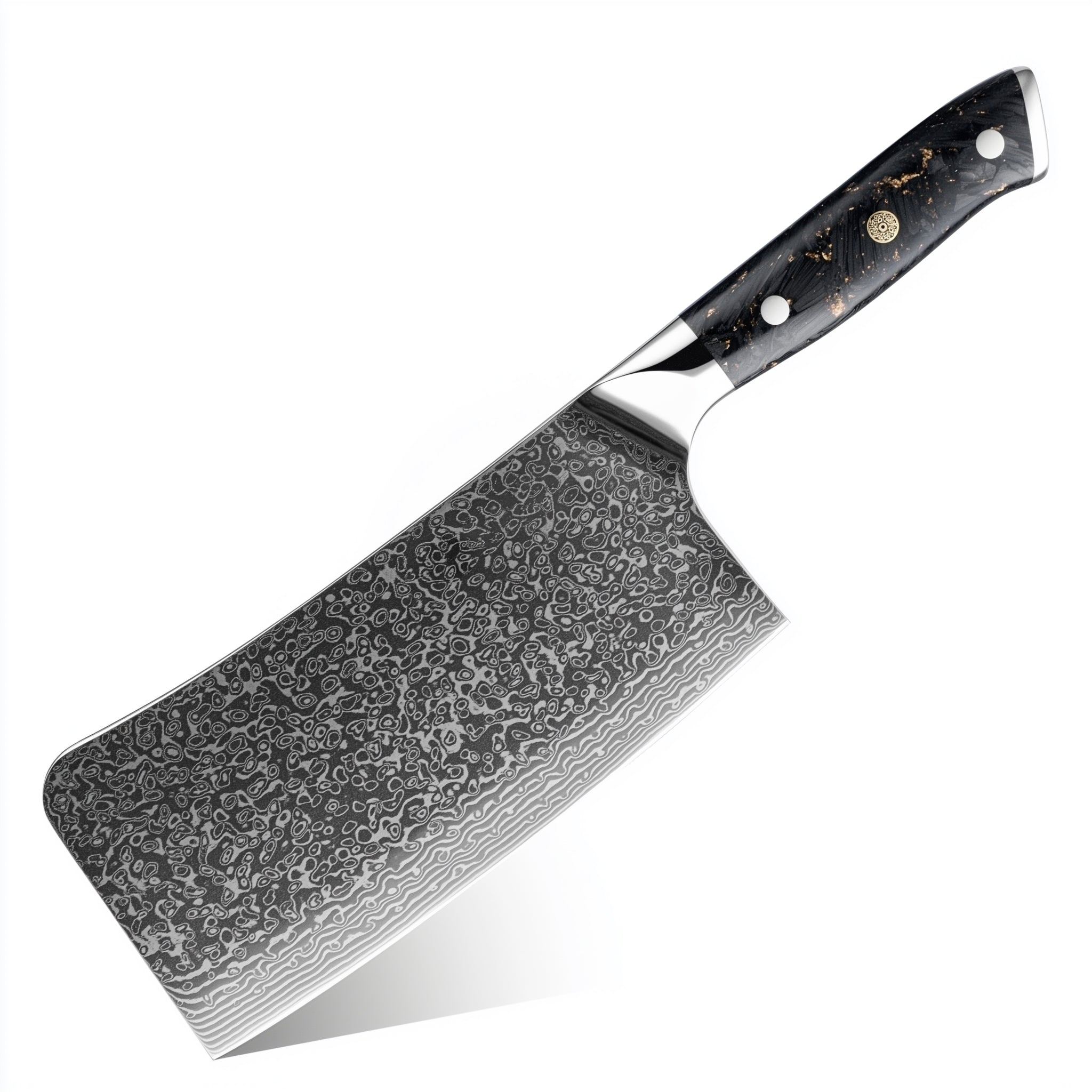 黑金系列,刀刃由67層大馬士革鋼製成,握柄處由碳纖維+金箔製成,適用於日常廚房料理,切肉,切片,蔬菜瓜果類,(家禽骨頭以及冷凍食品等堅硬的食物會影響刀的鋒利度,特殊需要請選擇專用砍骨刀)。